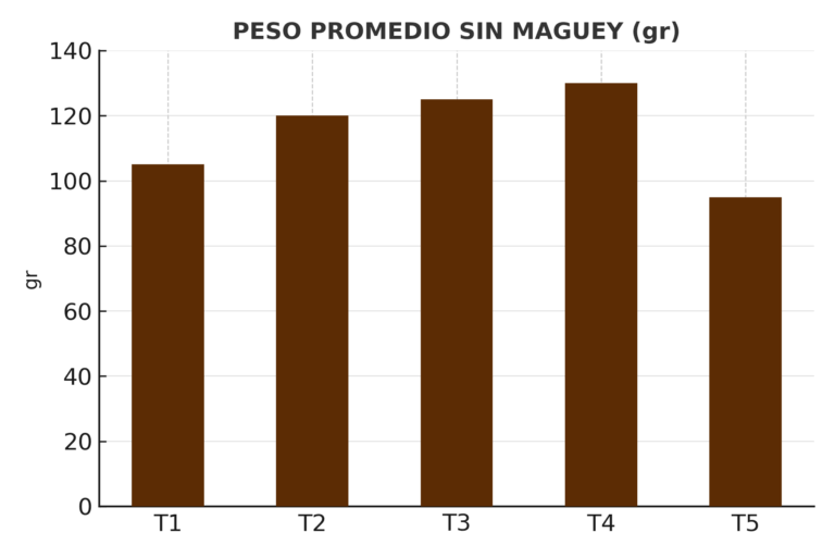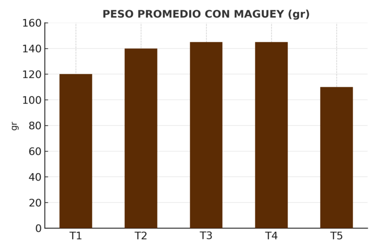 En el peso con maguey, T3 y T4 alcanzaron los mejores resultados con 147 g, mientras que Banpak mostró un excelente comportamiento en peso sin maguey (131 g).