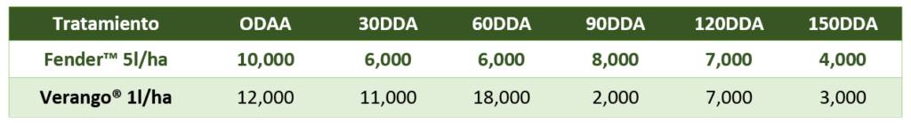 - Se evaluó la eficacia de Fender™ frente a Verango® (Fluopyram) con acción sistémica que interrumpe la producción de energía celular.