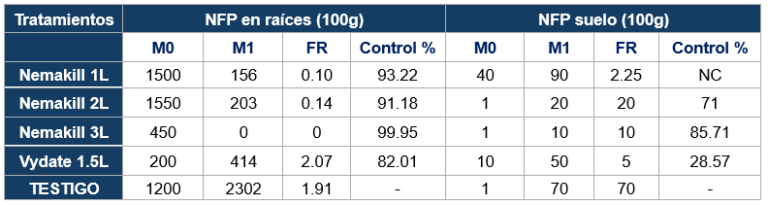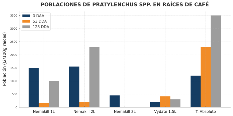 - A los 128 DDA, los tratamientos con Nemakill™ mantuvieron poblaciones significativamente más bajas.