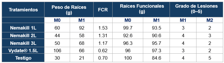 - Según los datos de la Tabla 1, Nemakill™ promovió un notable crecimiento radicular.