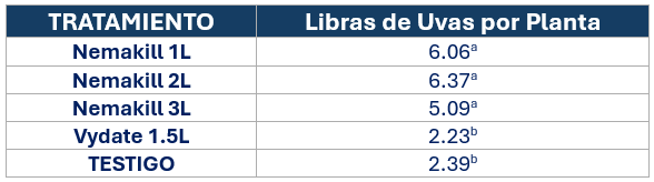 La Tabla 3 muestra que Nemakill™ permitió duplicar la productividad frente al control químico y el testigo: