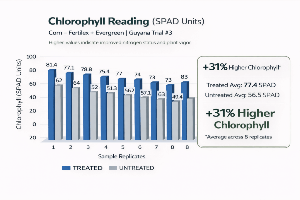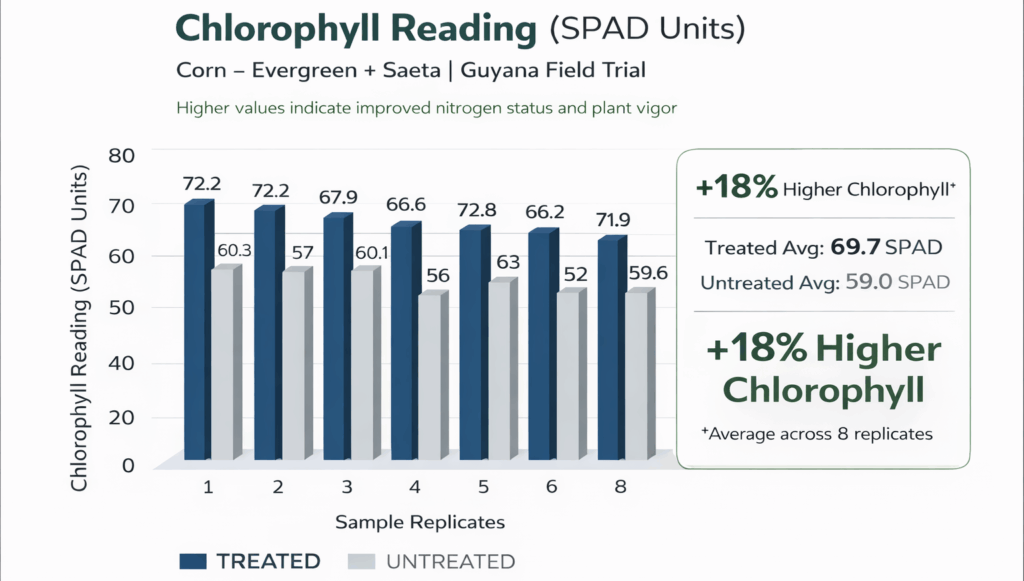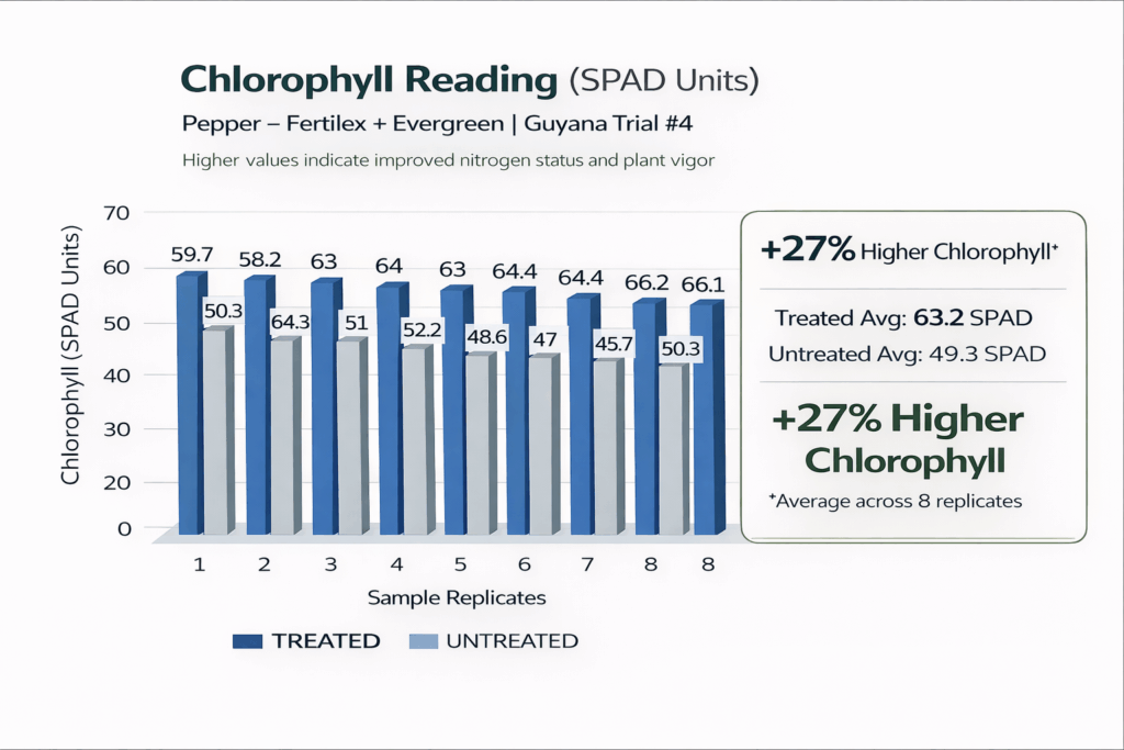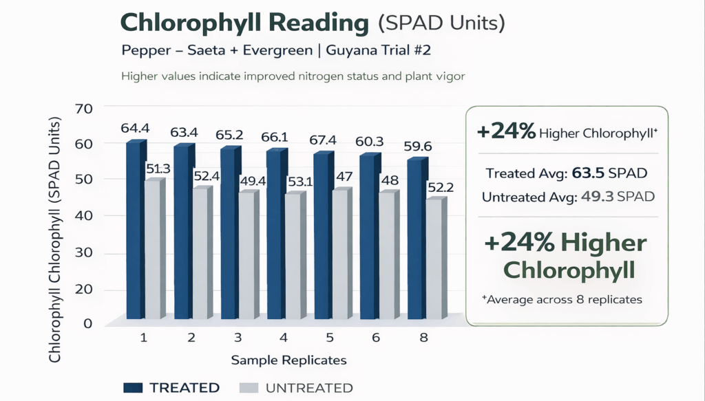 - Treated corn and pepper consistently showed higher chlorophyll readings than untreated plots.